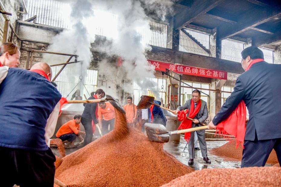年豐時稔,穰穰滿家。紅彤彤的本地紅纓子高粱在制酒車間堆成一個個谷峰,黃永毅董事長、梁明鋒副董事長、吳瑛副董事長、喻蕾總裁、江貽燦總顧問、姚學中監事長、曾祥坤副總經理、韓萍副總經理、龍雨總監、張志煒總經理共同鏟下下沙的首鏟,紅糧飛舞,激情飛揚,標志著天朝上品開啟新一輪釀酒周期。
