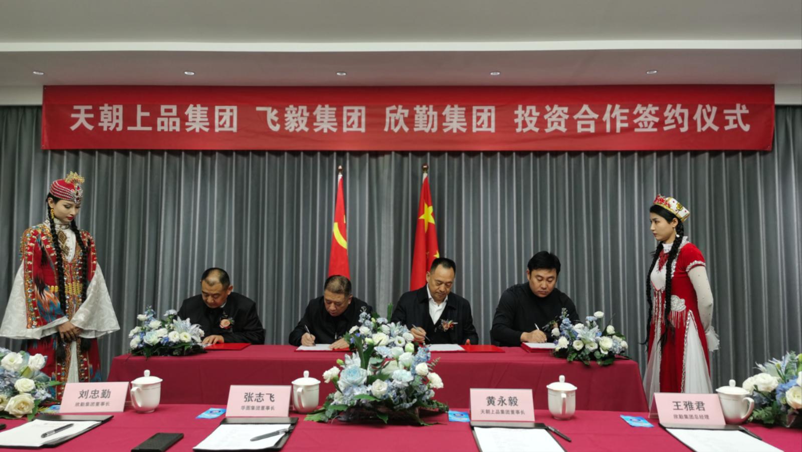 近日,天朝上品集團與飛毅集團、欣勤集團在欣勤集團北京總部舉行投資合作簽約儀式。天朝上品集團董事長黃永毅、華圖集團董事長張志飛、欣勤集團董事長劉忠勤、飛毅集團董事長幸敬華出席簽約儀式。三大集團確定成立北京飛毅國際商貿有限公司,同時作為天朝上品(北京)全國運營中心,天朝上品跨界融合邁出了新的步伐。