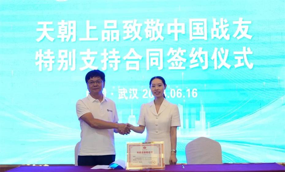 在本次大會上,天朝上品集團聘請華圖集團董事長張志飛,戰友集團黨委書記、董事長楊建橋擔任天朝上品集團共同主席。楊建橋董事長表示,戰友集團是一支以退役軍人和共產黨員為主體的團隊。“戰友”是我們的共同名稱,“鐵軍”是一個品牌標簽。雖然大家脫下了軍裝,轉移了戰場,但是退役不退色,轉業不轉向。天朝上品就是“國潮上品”。戰友集團與之結盟,相信必將在更廣闊的市場攜手并進,在更強大的平臺上書寫新的輝煌。我們要巧借共推綿柔醬香中國酒業團體新標準的東風,成就退役軍人轉移戰場之后的新輝煌!
