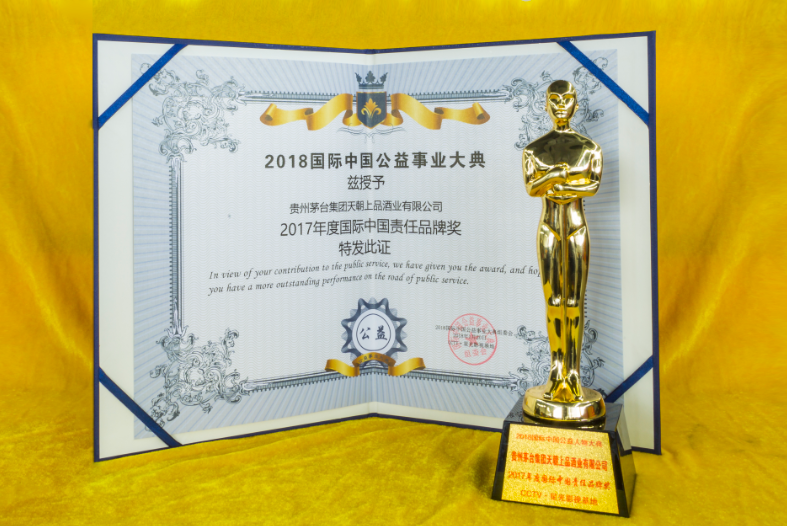 2018年1月20日,2018國際中國公益事業大典在北京中國中央電視臺·星光影視基地盛大啟動,天朝上品在本次盛典中榮獲“2017年度國際中國責任品牌獎”,文化部原副部長潘振宙為天朝上品頒獎。