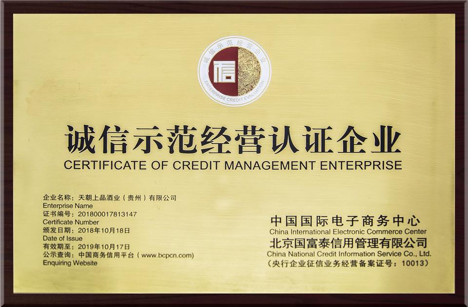 2018年10月17日,中國國際電子商務(wù)中心、北京國富泰信用管理有限公司綜合評(píng)價(jià)認(rèn)證,授予天朝上品“誠信示范經(jīng)營認(rèn)證企業(yè)”,并在央行企業(yè)征信業(yè)務(wù)經(jīng)營備案。