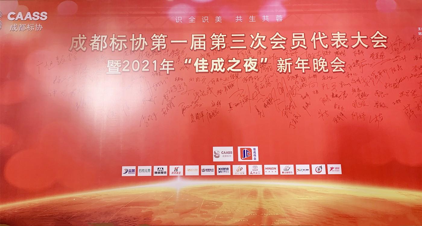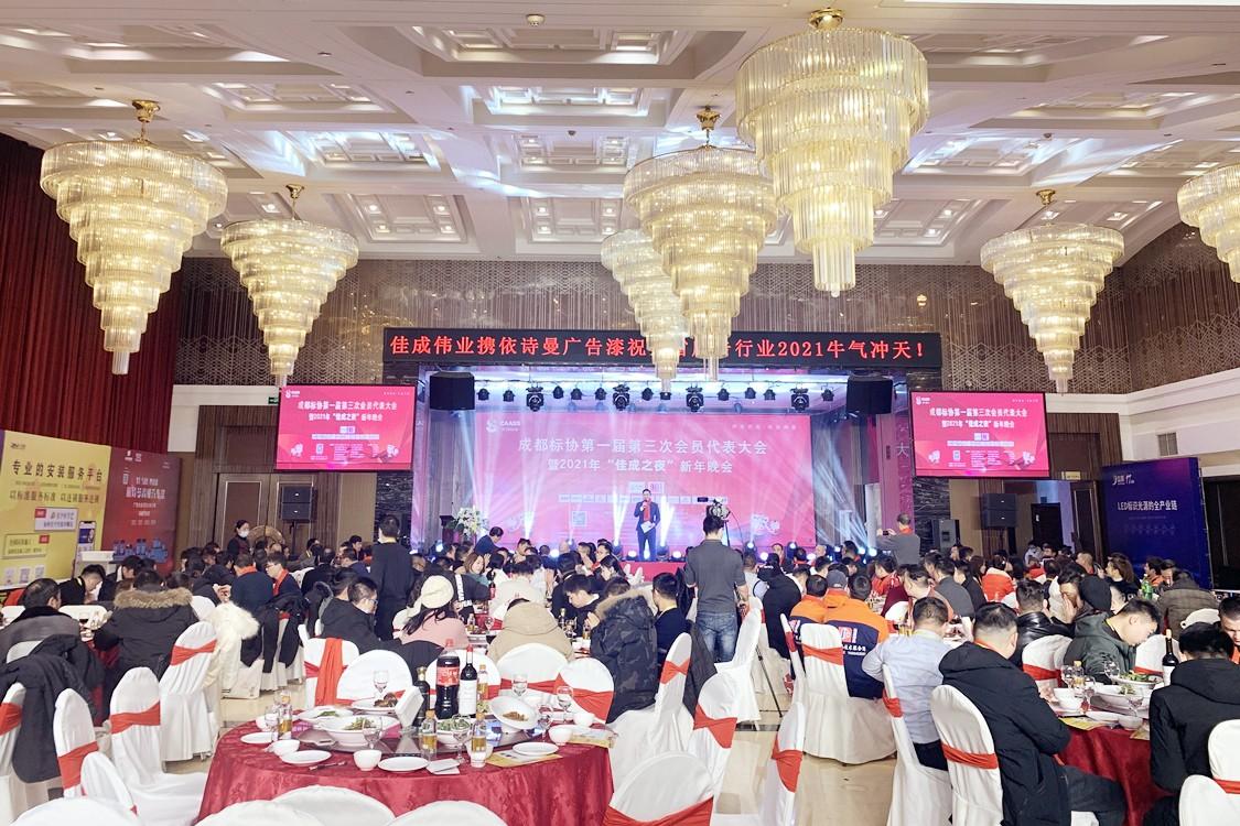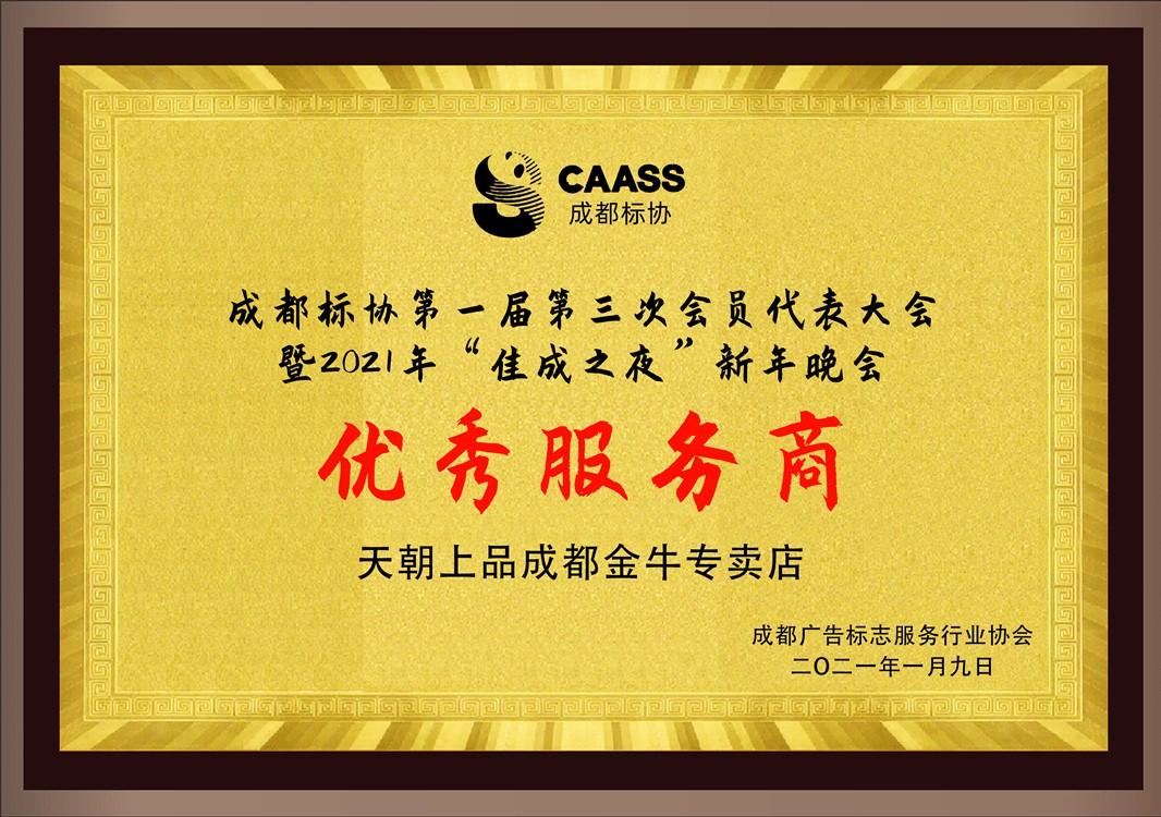 2021年1月9日,成都廣告標識服務行業協會第一屆第三次會員代表大會暨2021年“佳成之夜”新年晚會在蓉舉行。本次活動由成都市金牛區天朝上品專賣店贊助,成都市機械行業協會、成都智能焊接裝備行業協會等230余家會員單位代表出席。在本次活動中,天朝上品成都金牛區專賣店喜獲成都標協頒發的“優秀服務商”榮譽。