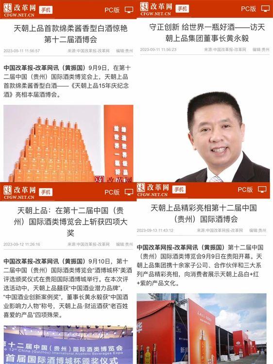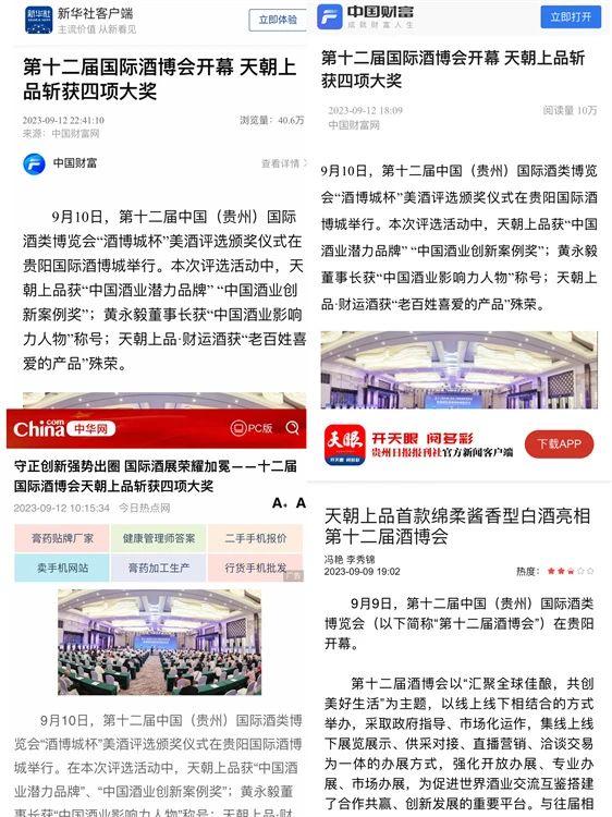 9月9日-12日,以“匯聚全球佳釀 共創(chuàng)美好生活”為主題的第十二屆中國(貴州)國際酒類博覽會在貴陽舉辦。新華社客戶端、人民日報客戶端、中華網(wǎng)、中國財富網(wǎng)、改革網(wǎng)、搜狐、網(wǎng)易、《中國商界》、《貴商》雜志、貴州日報《天眼新聞》、貴州廣播電視臺《百姓關注》欄目、貴陽廣播電視臺《直通貴陽》欄目、貴州旅游在線、觀山湖區(qū)融媒體等多家媒體深入天朝上品展館,直擊活動現(xiàn)場,記錄精彩瞬間,報道天朝上品熱銷酒博盛況,專訪天朝上品集團負責人,這也是天朝上品繼中國綿柔醬香型白酒團體標準發(fā)布會之后,再次成為媒體持續(xù)關注的焦點和熱點。
