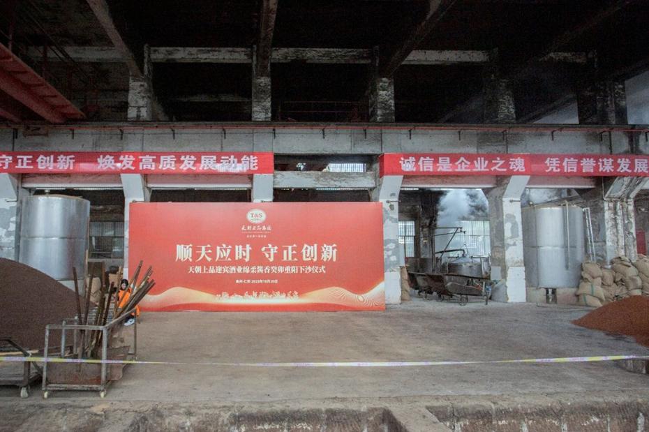 ▲天朝上品綿柔醬香癸卯重陽下沙儀式在天朝上品制酒車間完成