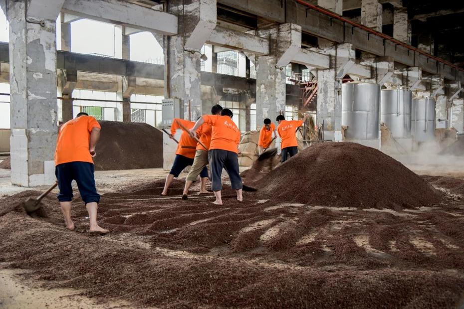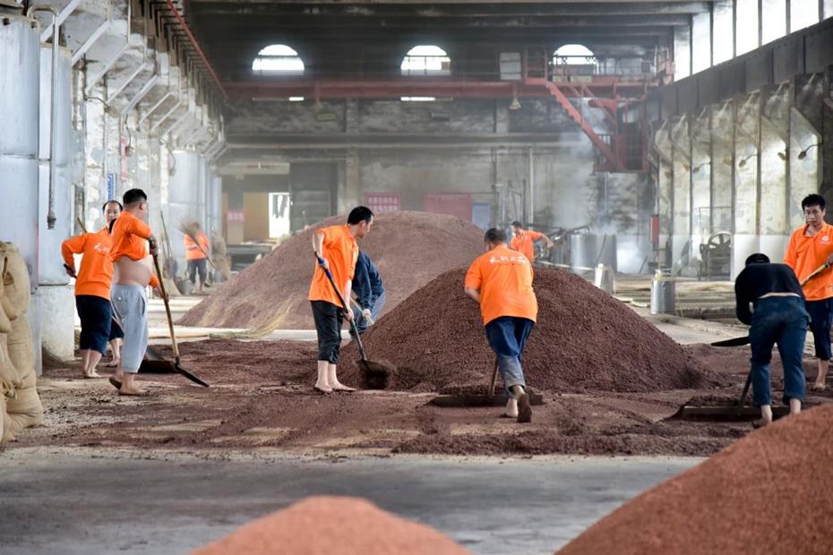 ▲天朝上品制酒車間工人們正在忙碌地進行下沙工序