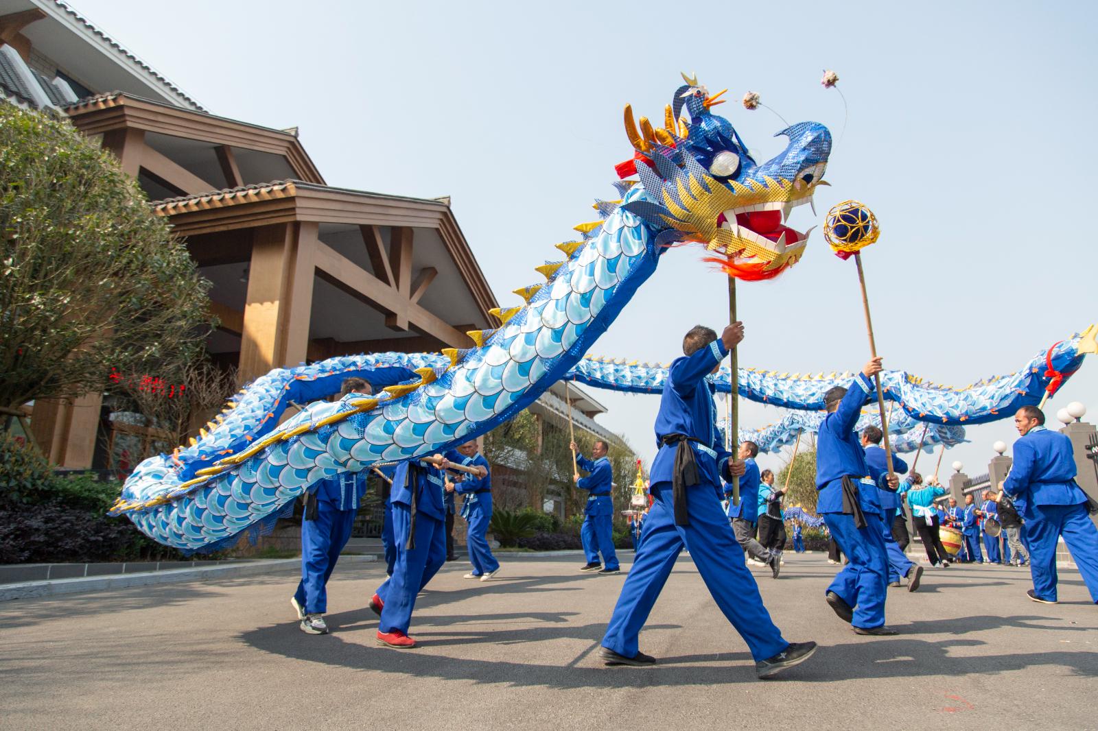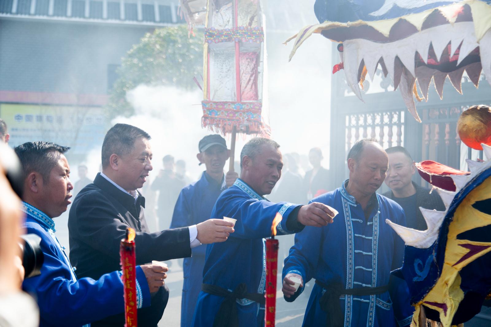 烏當區文旅局副局長吳靜宇、烏當區市場監督管理局副局長阮仁輝、烏當區工信局黨組成員俞霞、貴陽泉城五韻旅游文化投資開發有限公司副總經理梁小龍、新堡鄉馬頭村黨支部書記陳正勇,深圳市數壹數貳文化有限公司董事長李英杰,天朝上品老朋友貴州省三都水族自治縣九阡酒有限責任公司董事長鐘吉剛、貴州省珠寶商會會長蔡策程,天朝上品集團董事長黃永毅、副董事長吳瑛、CEO喻蕾、首席顧問江貽燦、副總經理曾祥坤、韓萍、財務總監龍雨,貴州天朝上品迎賓酒業(集團)有限責任公司總經理張志煒、綿柔上品酒業(深圳)有限公司總經理吳正滿、天朝上品(貴州)生態實業有限公司總經理羅軍印出席揭牌儀式。新堡鄉是一個民族風情濃郁的布依族聚居地,本次揭牌儀式結合非物質文化遺產項目申報,以三龍引路、護宅、治水、戲珠體現了當地鮮明的風俗特色,舉行了一場別具一格的神龍開財門儀式,天朝上品集團董事長黃永毅、天朝上品(貴州)葡萄酒有限公司總經理羅旭其共同為天朝酒莊揭牌。