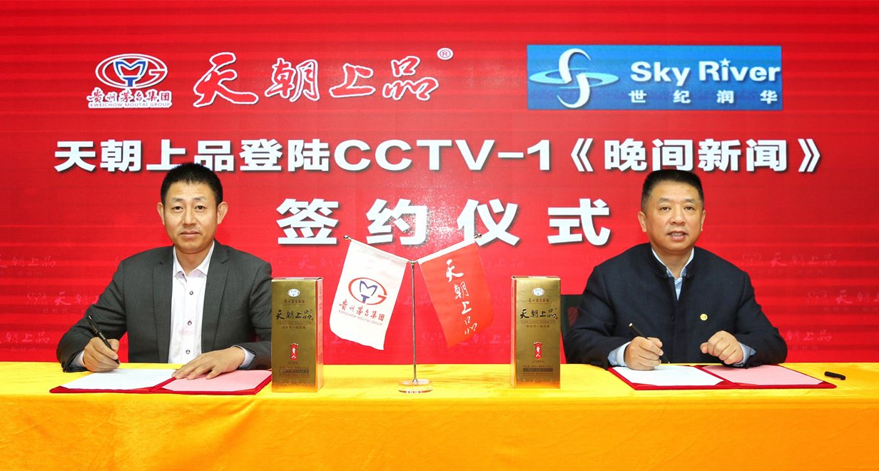 1月3日,天朝上品酒業與中央電視臺2017年4A級信用廣告代理公司正式簽署戰略合作協議,2018年全年強勢登陸CCTV-1《晚間新聞》欄目中插廣告。天朝上品酒業總裁黃永毅,副總裁江貽燦、吳瑛,財務總監李佳玲,北京世紀潤華廣告有限公司副總經理謝志明、直企部經理朱麗菊等出席簽約儀式。