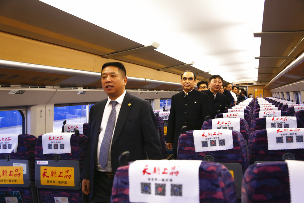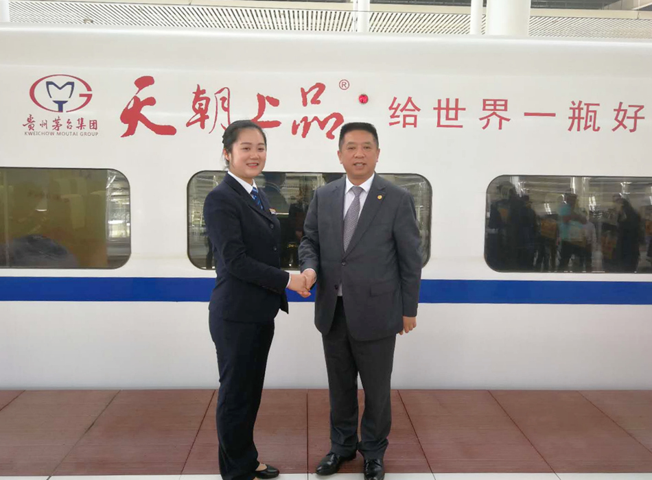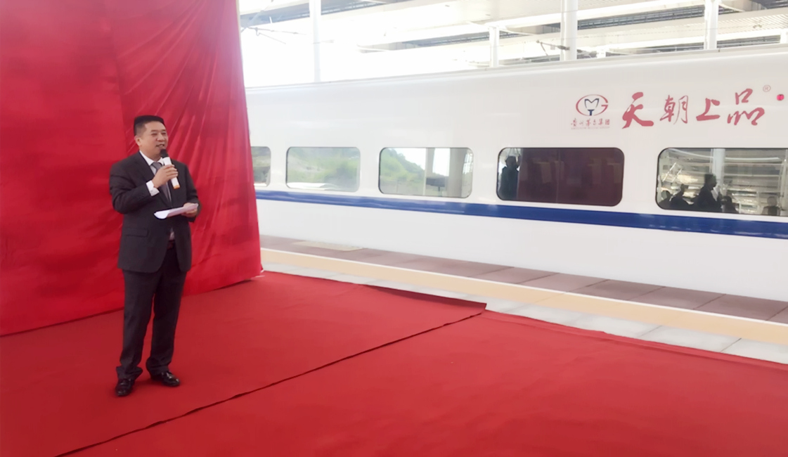 2018年4月18日,由成都鐵路局貴陽(yáng)客運(yùn)段值乘的3組貴渝、滬昆、貴廣線(xiàn)高鐵動(dòng)車(chē)組“天朝上品號(hào)”品牌專(zhuān)列首發(fā)式在貴陽(yáng)北站隆重舉行。天朝上品酒業(yè)副董事長(zhǎng)兼總裁黃永毅,副總裁江貽燦,總裁助理曾祥坤、韓萍,各大區(qū)負(fù)責(zé)人,成鐵傳媒貴州分公司總經(jīng)理丁航,貴州新黑馬傳媒董事長(zhǎng)毛婧、總經(jīng)理越飛,人人投創(chuàng)始人鄭林、聯(lián)合創(chuàng)始人王攀,北京首汽集團(tuán)旅游車(chē)公司總經(jīng)理朱樹(shù)增,以及聞?dòng)嵹s來(lái)的全國(guó)經(jīng)銷(xiāo)商代表等共同出席首發(fā)式。