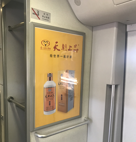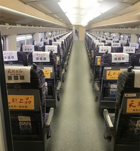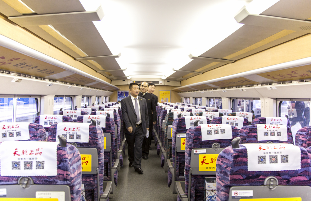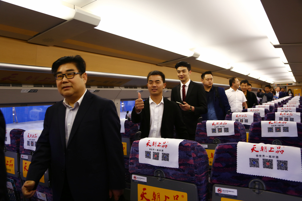 出席首發(fā)式的領(lǐng)導(dǎo)和嘉賓一同登上“天朝上品號(hào)”品牌專(zhuān)列,天朝上品的品牌元素觸目皆是,從車(chē)身彩貼、車(chē)身雙門(mén)貼、車(chē)內(nèi)海報(bào)、行李架膠貼、頭片、桌貼,到列車(chē)視頻和播音系統(tǒng),實(shí)現(xiàn)了360度全方位展示,充分發(fā)揮高鐵平臺(tái)聚集人流的獨(dú)特優(yōu)勢(shì),彰顯了高鐵媒體網(wǎng)絡(luò)性強(qiáng)、精準(zhǔn)性高、覆蓋面廣的特點(diǎn),將“天朝上品給世界一瓶好酒”的核心理念傳遞給大眾消費(fèi)者。