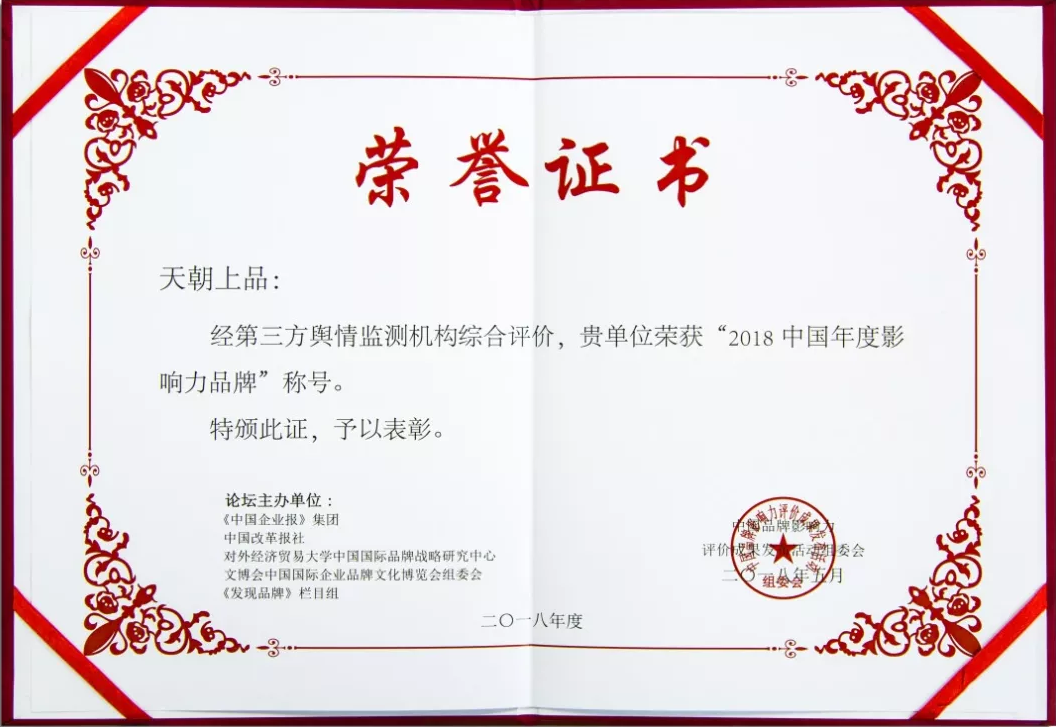 2018年5月24日至25日,2018(第五屆)中國(guó)品牌影響力評(píng)價(jià)成果發(fā)布活動(dòng)在京舉行,本屆評(píng)選活動(dòng)由《中國(guó)企業(yè)報(bào)》集團(tuán)、中國(guó)改革報(bào)社、對(duì)外經(jīng)濟(jì)貿(mào)易大學(xué)中國(guó)國(guó)際品牌戰(zhàn)略研究中心、文博會(huì)中國(guó)國(guó)際企業(yè)品牌文化博覽會(huì)組委會(huì)、《發(fā)現(xiàn)品牌》欄目組聯(lián)合主辦,活動(dòng)現(xiàn)場(chǎng)嘉賓云集,相關(guān)機(jī)構(gòu)領(lǐng)導(dǎo)、知名經(jīng)濟(jì)學(xué)家以及企業(yè)代表500余人出席此次活動(dòng)。主辦方在現(xiàn)場(chǎng)發(fā)布了《2018中國(guó)品牌影響力評(píng)價(jià)報(bào)告》,對(duì)國(guó)內(nèi)具有較高行業(yè)影響力的企業(yè)進(jìn)行了頒獎(jiǎng),天朝上品榮獲“2018中國(guó)年度影響力品牌”大獎(jiǎng)。