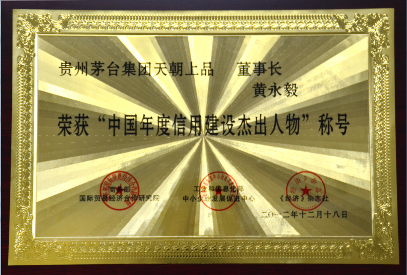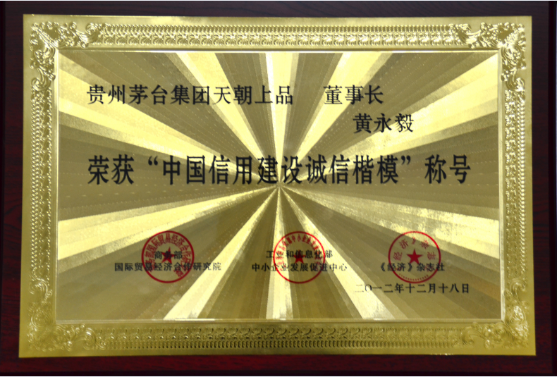 2012年12月22日,天朝上品為“第十屆中國企業信用年會暨2012中國誠信品牌建設峰會”協辦單位,授予“中國年度誠信企業”、“中國年度誠信品牌”、“商務部《商貿企業信用管理技術規范》標準試點單位”、“信用中國聯盟常務理事單位”殊榮。黃永毅董事長獲“中國信用建設誠信楷模”、“中國年度誠信企業家”、“中國年度信用建設杰出人物”稱號,江貽燦總監獲“中國年度信用建設功勛人物”稱號。