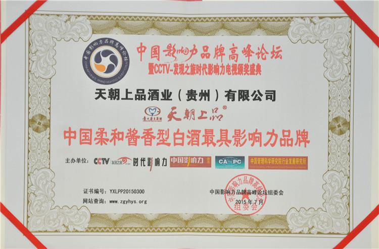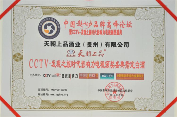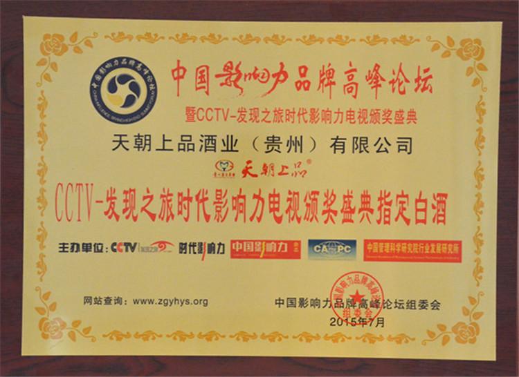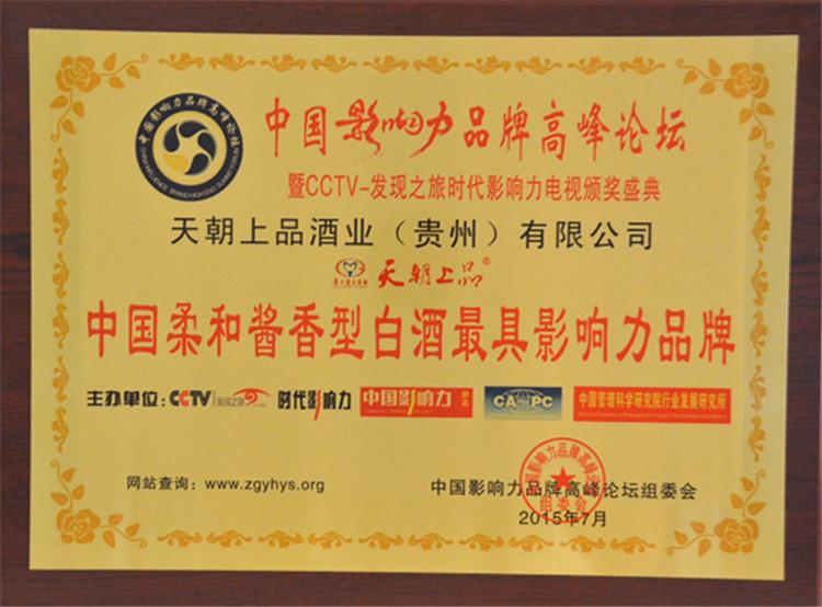 2015年7月26日,在中國影響力高峰論壇暨CCTV時代影響力電視頒獎典禮上,天朝上品酒業(yè)獲得“中國柔和醬香型白酒最具影響力品牌”,并作為“CCTV發(fā)現(xiàn)之旅時代影響力電視頒獎盛典指定白酒”。